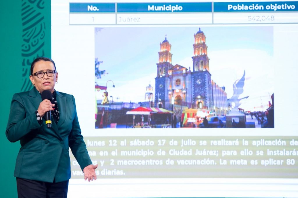 En conferencia matutina, la secretaria de Seguridad y Protección Ciudadana, Rosa Icela Rodríguez, informó que, una vez terminada la vacunación fronteriza en Sonora, desde este jueves y hasta el próximo sábado se vacunará en varios municipios fronterizos de Chihuahua, como Ascensión, Coyame del Sotol, Guadalupe, Janos, Manuel Benavides, Praxedis G. Guerrero y Ojinaga.