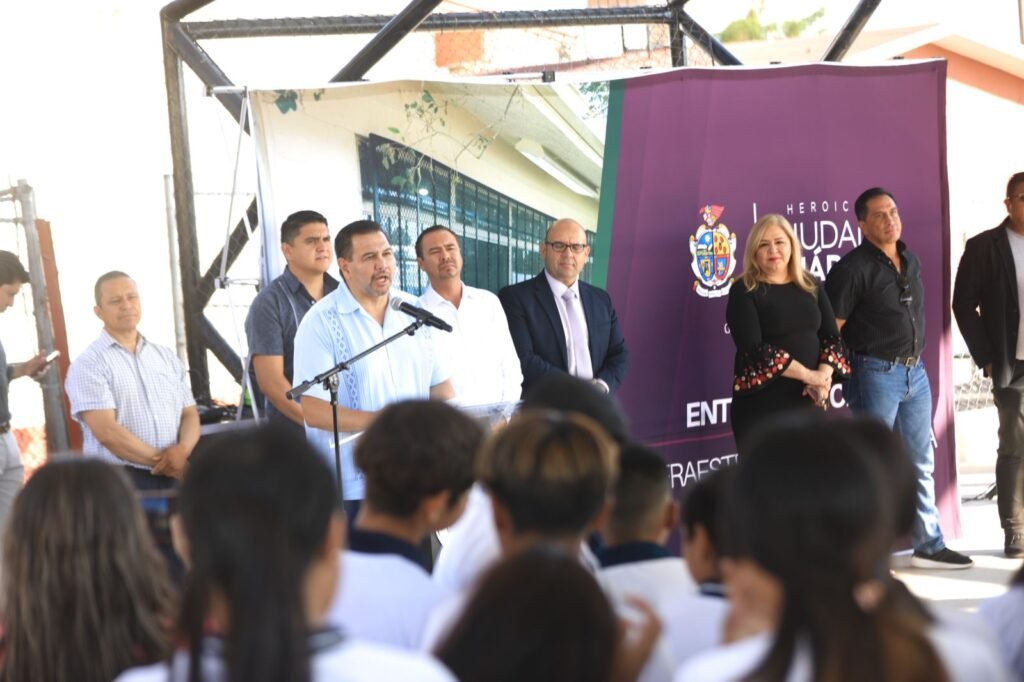 El Presidente Municipal, Cruz Pérez Cuéllar, encabezó la entrega de los trabajos de rehabilitación en la Telesecundaria Tarahumara, ubicada en la calle Creel, de la colonia Tarahumara, en la zona poniente de la ciudad.