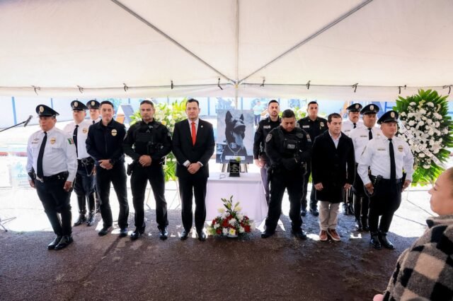 El alcalde Marco Bonilla, encabezó una guardia de honor para despedir y reconocer el heroísmo de Vico, perro policía que falleció en cumplimiento del deber tras durante un operativo de atención de violencia familiar en un domicilio ubicado “La Cuadrilla” en el Ejido el Fresno.