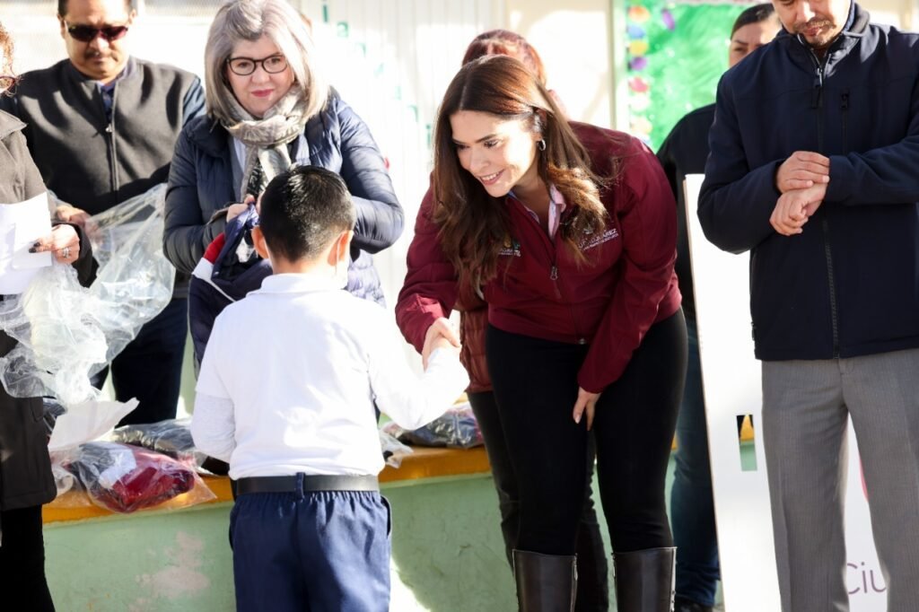 La presidenta del Sistema de Desarrollo Integral de la Familia de Juárez (DIF), Rubí Enríquez y el regidor Jorge Bueno, entregaron al alumnado de la Escuela Primaria Miguel Enríquez Guzmán, 426 chamarras durante un acto en donde participó la comunidad escolar.