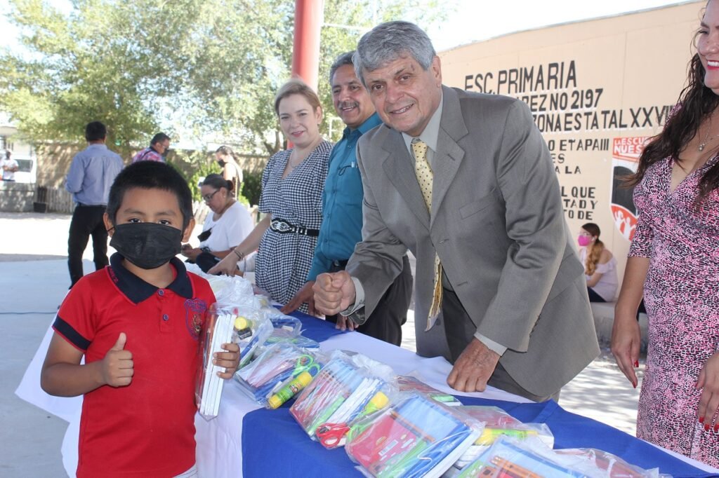La Secretaría de Educación y Deporte (SEyD) entregó paquetes de útiles escolares a estudiantes de la Escuela Primaria Benito Juárez, ubicada en el fraccionamiento Riberas del Bravo, en Ciudad Juárez.