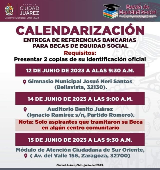 La Dirección de Educación Municipal anunció que el próximo lunes dará inicio la segunda entrega de referencias bancarias, por lo que se pide a los padres de familia que tramitaron con anticipación las becas escolares, acudir a las sedes donde les indica la plataforma digital.