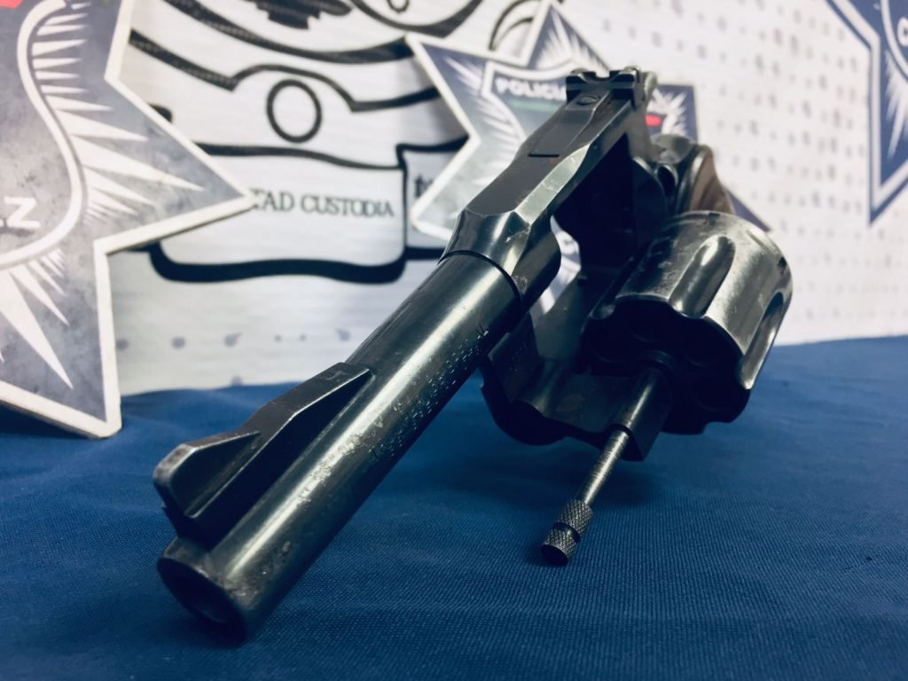 De inmediato los agentes preventivos lo detuvieron por protocolos de seguridad en donde al realizarle una inspección preventiva se le localizó fajada a la altura de la cintura un revólver calibre .38 especial, motivo por el cual fue detenido.