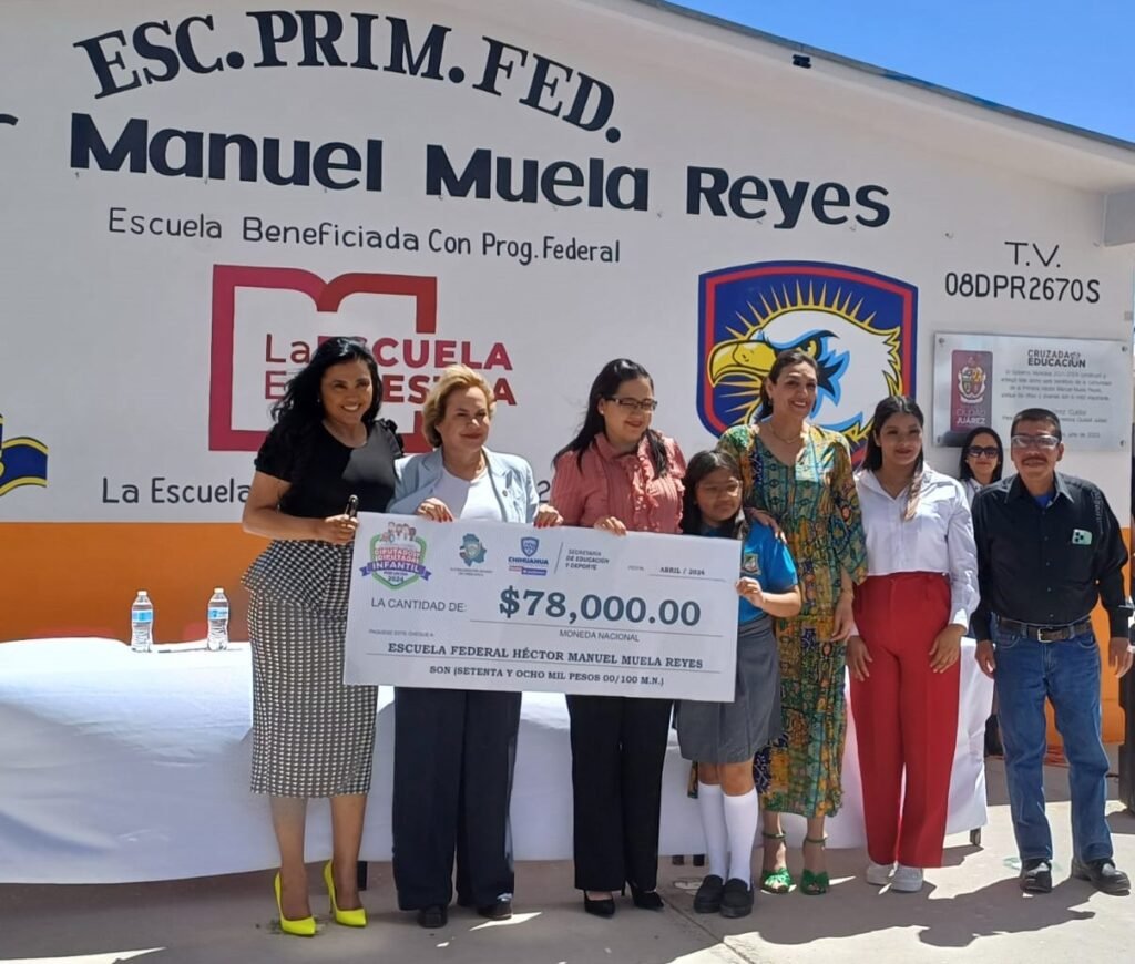 La presidenta del H Congreso del Estado de Chihuahua, hizo entrega simbólica de un cheque por 78 mil pesos que serán utilizados para mejoras en la Escuela Primaria Héctor Manuel Muela Reyes. El apoyo económico será entregado en la sesión el próximo 25 0 26 de abril.