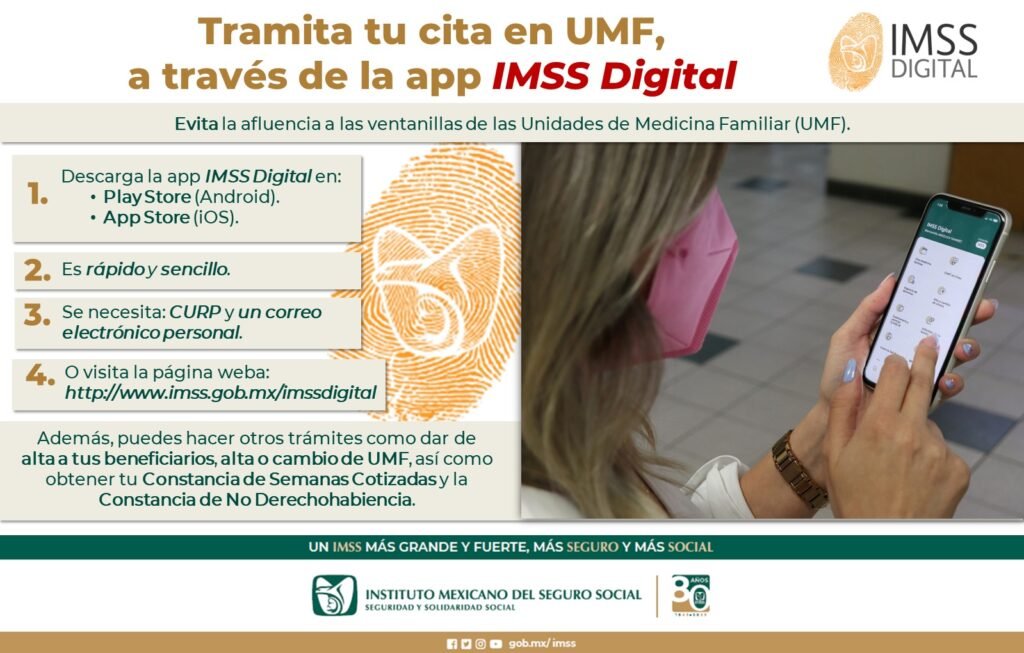 Asimismo, informó que en esta App además de agendar la cita médica familiar, se puede obtener el Numero de Seguridad Social (NSS), la Vigencia de Derechos ante la Institución, el Reporte Personalizado de Cotizaciones al IMSS (RPCI), el Alta Patronal, la Inscripción en el Seguro de Riesgos de Trabajo, la Constancia de semanas cotizadas, la Constancia de no derechohabiencia, además de realizar el alta o cambio de Unidad de Medicina Familiar (UMF), entre otros importantes servicios.