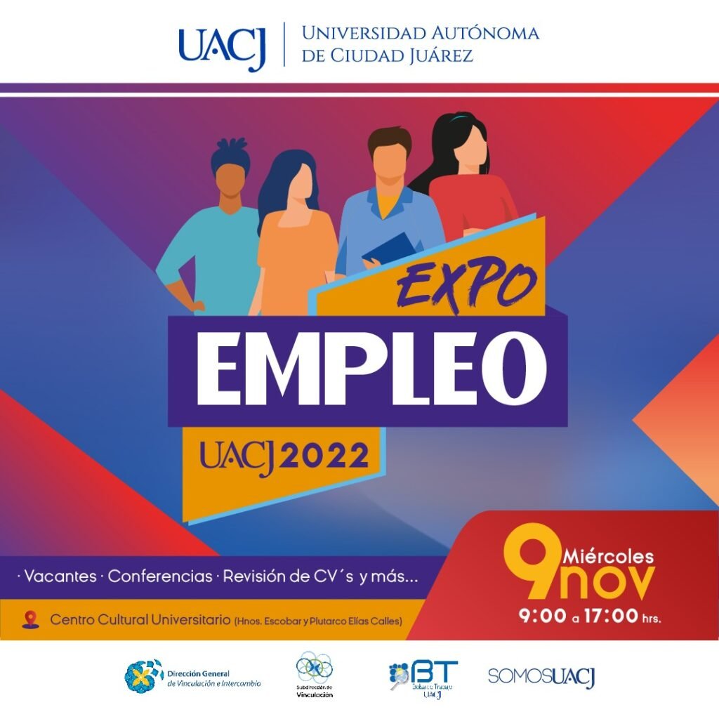 Conferencias, asesoramiento con el Currículum Vitae e información de trabajos disponibles son algunas de las actividades que la Universidad Autónoma de Ciudad Juárez ofrecerá en la Expo Empleo 2022, que se realizará el próximo 9 de noviembre, a partir de las 9:00 a. m., en el Centro Cultural Universitario.