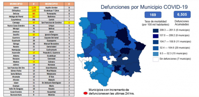 Del total de decesos confirmados en el reporte epidemiológico al 28 de abril, 27 corresponden a Juárez, 10 a Chihuahua, 5 a Delicias, uno a Parral, uno a Camargo, uno a Saucillo, uno a Ascensión, uno a Madera y uno a San Francisco de Conchos.
