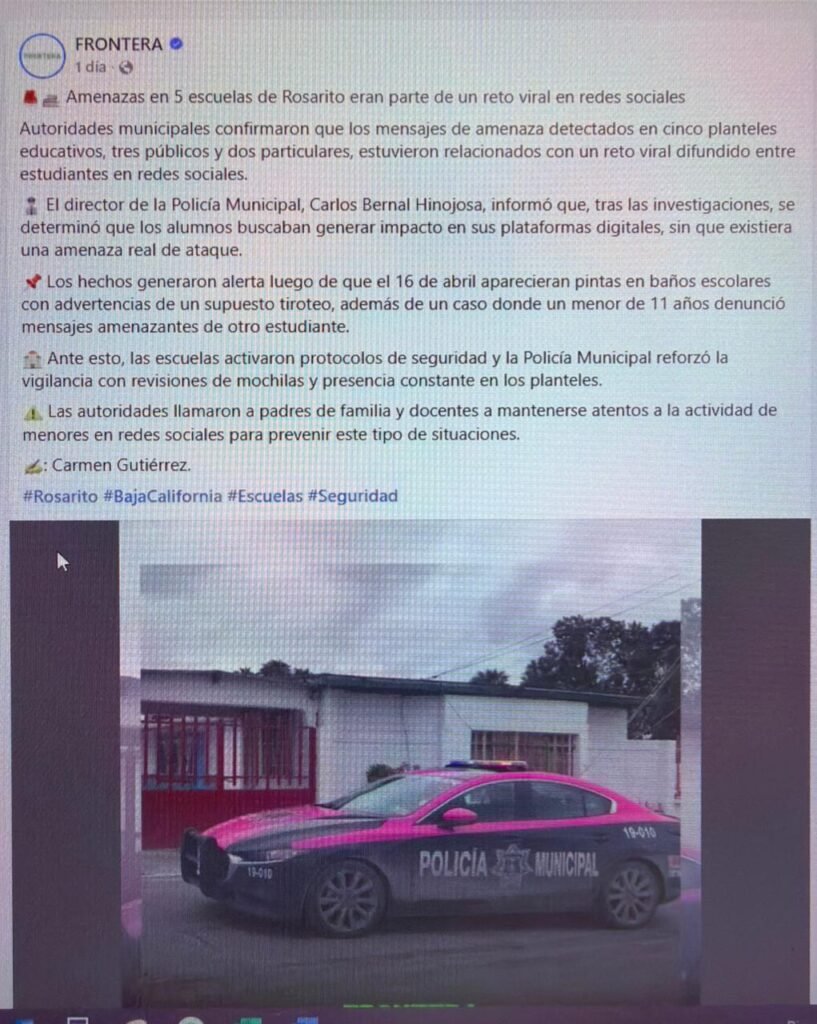 La Secretaría de Seguridad Pública Municipal (SSPM) informó que las recientes amenazas de tiroteo reportadas en cuatro escuelas de Ciudad Juárez no son reales, sino parte de un “reto” viral entre adolescentes que también se ha presentado en otras ciudades del país.