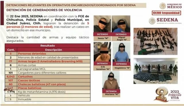Luis Carlos Sandoval, secretario comandante de Sedena, dio a conocer que en Ciudad Juárez en coordinación con la Fiscalía General del Estado, se logró la detención de cinco personas, entre ellos dos menores de edad, tras un cateo en una vivienda de la colonia Eréndira.