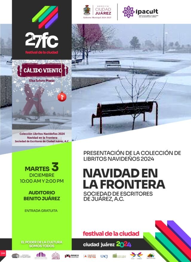 El Instituto para la Cultura del Municipio de Juárez (IPACULT), en colaboración con la Sociedad de Escritores de Juárez, invita a la comunidad a celebrar la literatura en el evento “Navidad en la Frontera”, el cual forma parte del Festival de la Ciudad.
