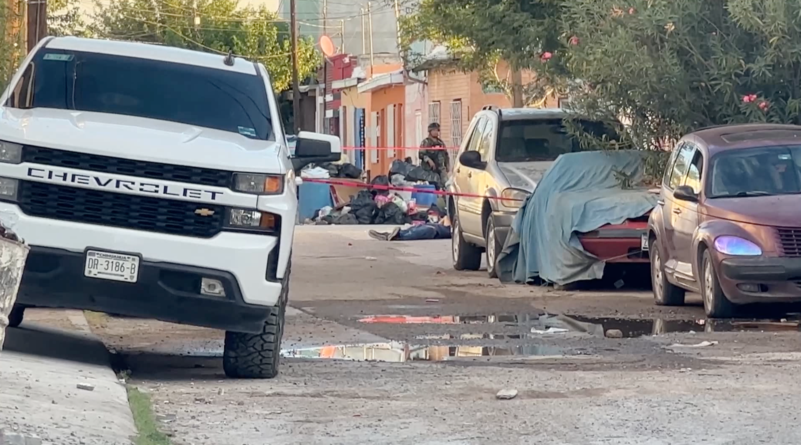 El segundo hecho violento se reportó en el cruce de las calles Vistas de la Junta Oriente y Vistas de la Junta Sur, de la colonia Vistas de Zaragoza, donde localizaron un cadáver encobijado sobre basura en un predio.