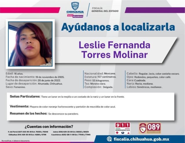 Si cuenta con información de utilidad, veraz y real que pueda ayudar a dar con el paradero de Leslie Fernanda Torres Molinar, favor de comunicarse a las líneas de emergencia 911 o 089 de Denuncia Anónima.
