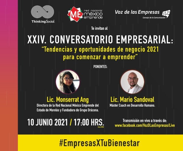 El Consejo de la Comunicación (CC) en colaboración con la Red Nacional México Emprende y la agencia de marketing Thinking Social, invita al sector corporativo público y privado del país al XXlV Conversatorio Empresarial: “Tendencias y oportunidades de negocio 2021 para comenzar a emprender”, que se transmitirá este jueves en punto de las 17:00 horas a través de www.facebook.com/VozDLasEmpresas/Live.