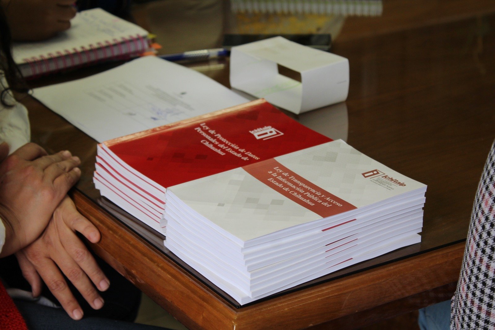 La coordinadora de Transparencia repartió entre los presentes un ejemplar de la Ley de Transparencia y Acceso a la Información del Estado de Chihuahua, y de la Ley de Protección de Datos Personales del Estado de Chihuahua, ambos editados y distribuidos por el ICHITAIP.