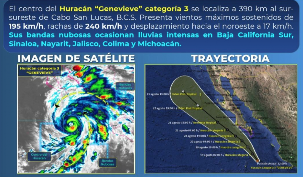 Genevieve tenía vientos máximos sostenidos de 195 kilómetros por hora (120 millas por hora) el martes en la noche y estaba a 390 kilómetros (240 millas) al sur-sureste de la punta de la Península de Baja. agregó el NHC. Se movía con dirección noroeste a 17 km/h (10 mph).