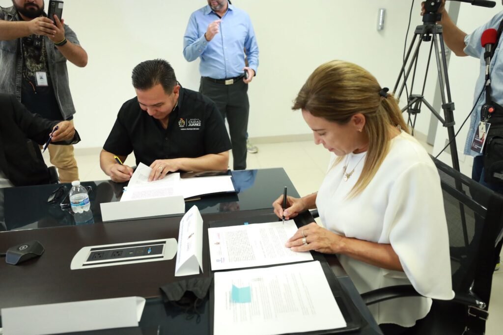 Además del Presidente Cruz Pérez Cuéllar y María Angélica Granados Trespalacios, en la firma del acuerdo estuvieron Arturo Acosta Fernández, director de Economía Social estatal; Fernando Alba Quiñonez, titular de la Subsecretaria de Minería, Industria y Energía estatal y Luis Villalobos Máynez, representante del Ayuntamiento de Juárez ante el Gobierno del Estado.