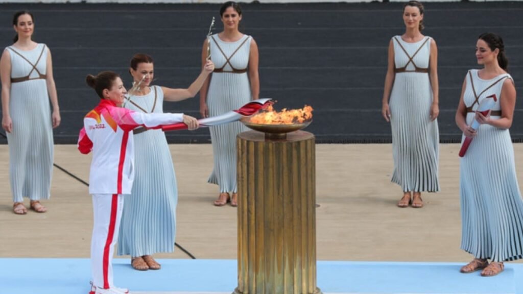 En la sede de mármol de los primeros Juegos Olímpicos modernos en 1896, el presidente del Comité Olímpico Helénico y miembro del Comité Olímpico Internacional (COI), Spyros Capralos, pasó la llama sagrada a Yu Zaiqing, vicepresidente del COI, representante especial y vicepresidente de Beijing 2022 y vicepresidente del Comité Olímpico Chino.