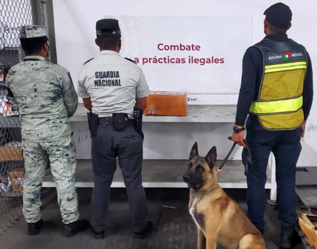 Al realizar revisiones preventivas en el recinto fiscalizador de carga aérea, del Aeropuerto Internacional de Tijuana, Baja California, guardias nacionales y verificadores, con el apoyo de un binomio canino localizaron una caja, en la que dieron señal positiva ante la posible presencia de algún material u objeto ilícito.