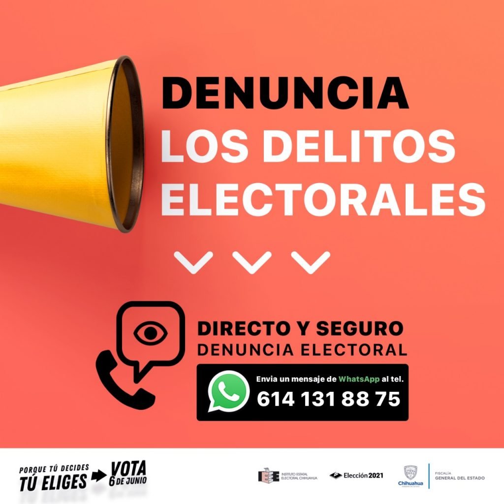 El Instituto Estatal Electoral de Chihuahua (IEE) y la Fiscalía General del Estado de Chihuahua (FGE) hacen un llamado a la ciudadanía para que denuncie delitos electorales y abren números locales directos y seguros. Se debe marcar directamente al 429-3300 extensiones 11442 y 10579, o bien, mandar un whatsapp al 614-131-8875.