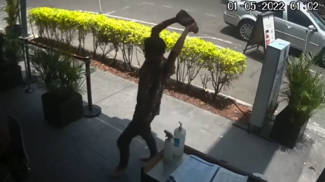 En las imágenes difundidas se aprecia como un hombre con camisa café le avienta una piedra en la cabeza a uno de los comensales que se encontraba comiendo en la zona exterior del restaurante; luego del ataque, el hombre hace una señal con la mano y huye del lugar, no sin antes ser confrontado por uno de los comensales.