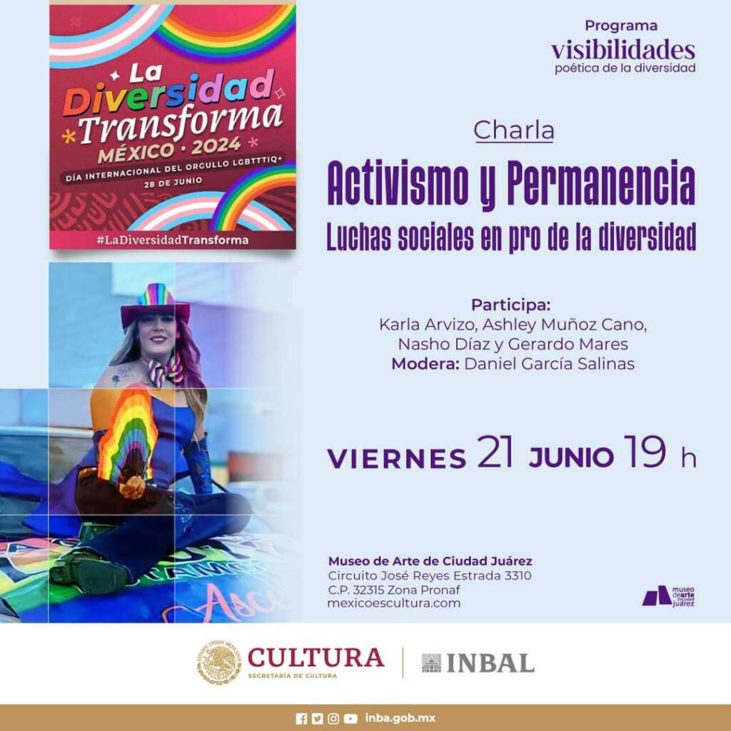 El viernes 21 de junio a las 19:00 horas en el Museo de Arte de Ciudad Juárez tendrá lugar la charla Activismo y permanencia. Luchas sociales en pro de la diversidad.