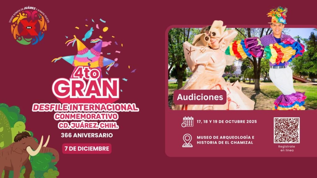 Hoy dieron inicio las audiciones para formar parte del Gran Desfile Conmemorativo 2025, mismas que se estarán realizando a partir de este día, mañana sábado y el próximo domingo en las instalaciones del Museo de Arqueología e Historia de El Chamizal, a partir de las 10:00 de la mañana.