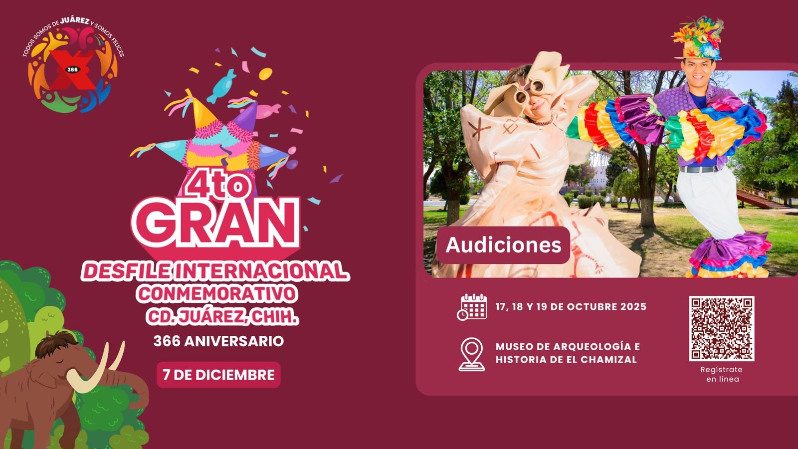 Hoy dieron inicio las audiciones para formar parte del Gran Desfile Conmemorativo 2025, mismas que se estarán realizando a partir de este día, mañana sábado y el próximo domingo en las instalaciones del Museo de Arqueología e Historia de El Chamizal, a partir de las 10:00 de la mañana.