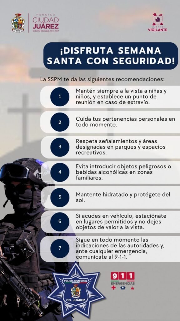 La Secretaría de Seguridad Pública Municipal informa que se llevará a cabo un despliegue operativo especial de seguridad con motivo de las celebraciones de Semana Santa, con el objetivo de salvaguardar la integridad de las familias juarenses en espacios públicos de alta afluencia.