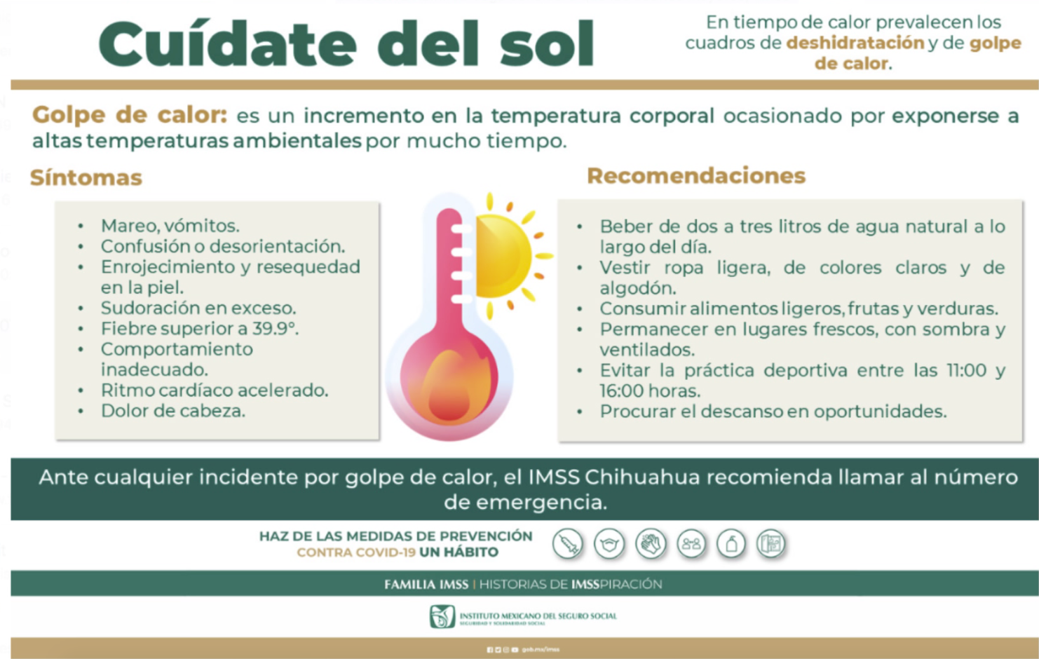 El Instituto Mexicano del Seguro Social (IMSS) en Chihuahua advierte que el exceso de calor puede causar daños físicos como el llamado “golpe de calor”, deshidratación, problemas gastrointestinales y modificación del comportamiento de las personas, como es la irritabilidad y agresividad.
