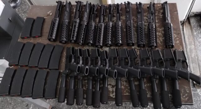 El personal examinó minuciosamente el automóvil y en el asiento trasero localizó una caja de zapatos con 12 cargadores para arma larga y en la cajuela, en la sección de la llanta de refacción, encontraron 12 empuñaduras. Todas aparentemente son piezas de fusiles.