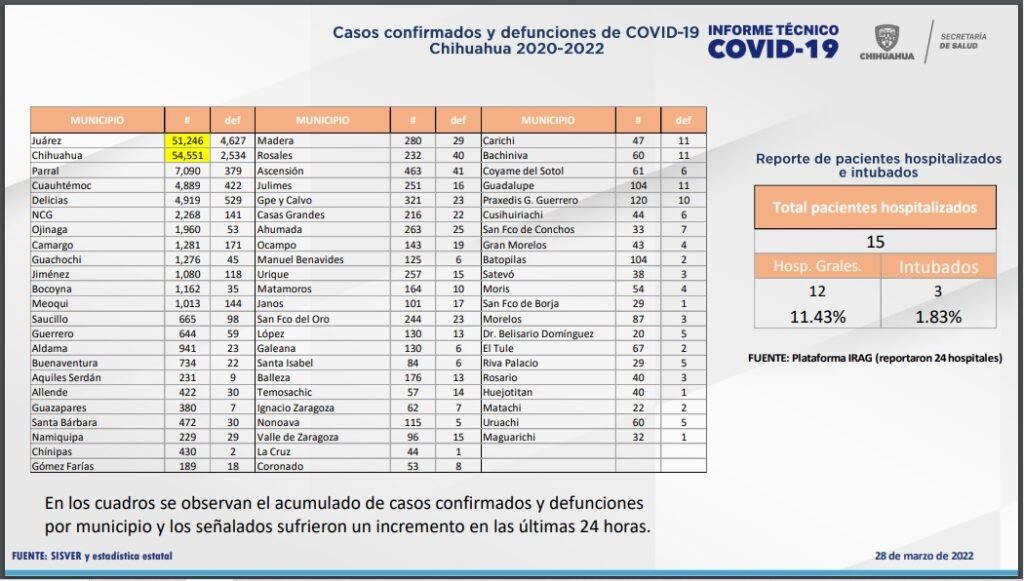 El Gobierno del Estado, a través de la Secretaría de Salud de Chihuahua, presenta este 28 de marzo el reporte COVID-19, en el cual se registra un acumulado de 143 mil 213 (+29) casos confirmados, 126 mil 460 (+1) casos recuperados, 103 mil 008 (+9) descartados y mil 663 (+1) casos sospechosos.
