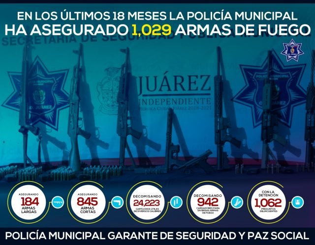 La Secretaría de Seguridad Pública Municipal informa que con acciones y resultados de la estrategia municipal de prevención y atención al delito en los últimos 18 meses la Policía Municipal ha asegurado mil 029 armas de fuego de diversos calibres, con la detención de mil 062 presuntos delincuentes pertenecientes a diferentes grupos criminales.