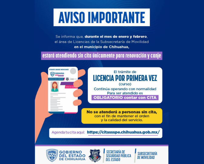La Secretaría de Seguridad Pública del Estado (SSPE), a través de la Subsecretaría de Movilidad, informa a la ciudadanía que durante el mes de enero y febrero los trámites de renovación de licencias de conducir se estarán atendiendo sin necesidad de cita, con el objetivo de agilizar el servicio y facilitar el acceso a este trámite.