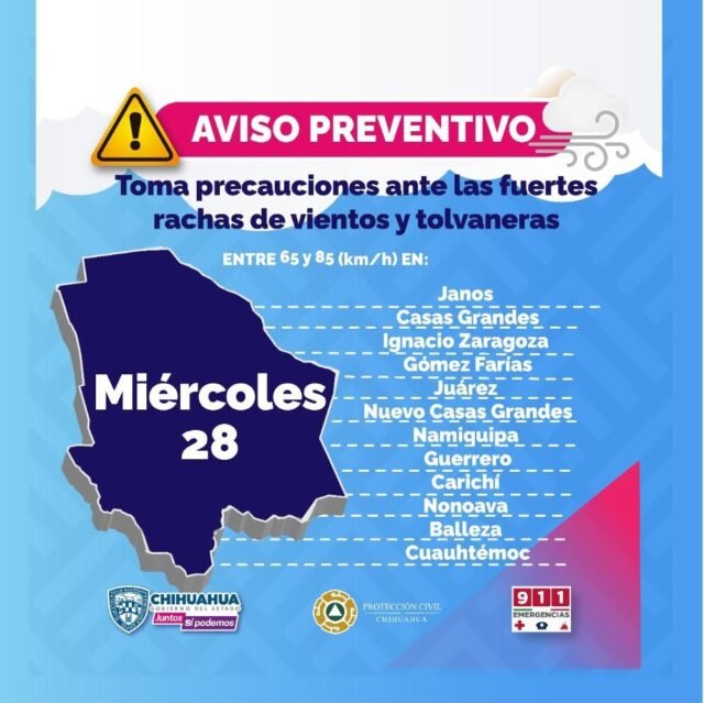 Para el resto del estado se prevén vientos entre 45 y 55 km/h, por lo que la CEPC advierte que las fuertes ráfagas de viento pueden ocasionar tolvaneras en los tramos carreteros de Chihuahua a Juárez, de Juárez a Ascensión, de Janos a Buenaventura y de Chihuahua a La Junta.