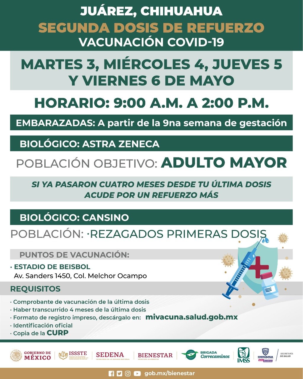 Para que los adultos mayores y mujeres embarazadas a partir de la novena semana de gestación tengan mejores defensas contra Covid-19, la Delegación Bienestar en Ciudad Juárez hizo un llamado a esta comunidad para que desde este martes 3 y hasta el viernes 6 de mayo acudan a recibir la segunda dosis de refuerzo en Ciudad Juárez.