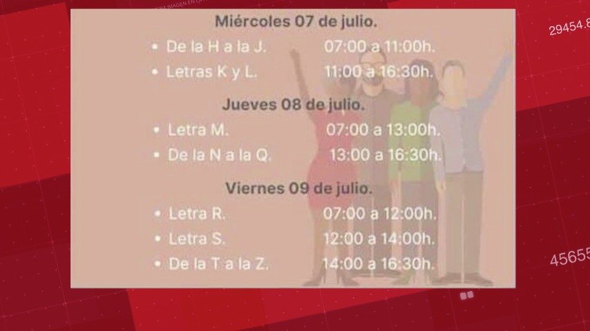 Miércoles 7 de julio, de la letra H a la JH de 7:00 a 11:00, mientras que las letras K y L será de 11:00 a 17:00. El jueves 8 de julio será para la letra M de 7:00 a 13:00, mientras de la N a la Q será de 13:00 a 17:00. Finalmente, el viernes 9 de julio corresponderá a la letra R de 7:00 a 12:00, la S de 12:00 a 14:00 y de la letra T a la Z de 14:00 a 17:00 horas.