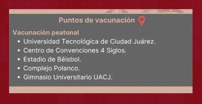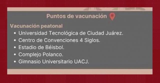 Para esta ocasión los puntos de vacunación se ubicarán en la Universidad Tecnológica de Ciudad Juárez, el Centro de Convenciones 4 Siglos, el Estadio de Béisbol Juárez, Complejo Polanco que se ubica en la avenida Antonio J. Bermúdez y Gimnasio Universitario de la UACJ.