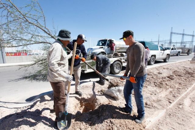 Trabajadores de la Dirección de Parques y Jardines plantaron hoy 60 árboles de distintas variedades en el nuevo parque lineal Can-Am, área ubicada entre el boulevard Francisco Villarreal Torres y la calle Tomas Fernández.