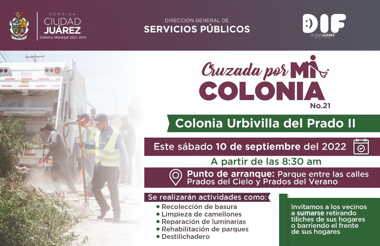 “El próximo sábado estaremos trabajando en la edición número 21 de Cruzada por mi Colonia el personal de las direcciones de limpia, Parques y Jardines y Alumbrado Público; nos dirigimos a Urvibilla del Prado II para atender las peticiones de los vecinos de dicha área”, indicó.