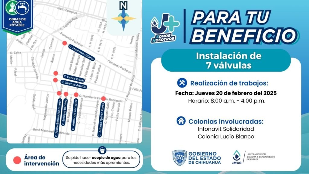Estos trabajos se realizarán mañana jueves 20 de febrero, entre las 8:00 y las 16:00 horas y forman parte del programa de Sectorización que lleva a cabo la Junta de Agua y Saneamiento de Juárez.