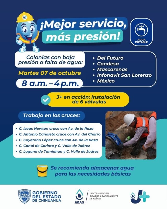 El Departamento de Eficiencia Física de la Junta de Agua y Saneamiento de Juárez, realizará la instalación de 6 válvulas nuevas, este martes 7 de octubre, que permitirán un mejor control y suministro del agua que llega a los hogares juarenses.