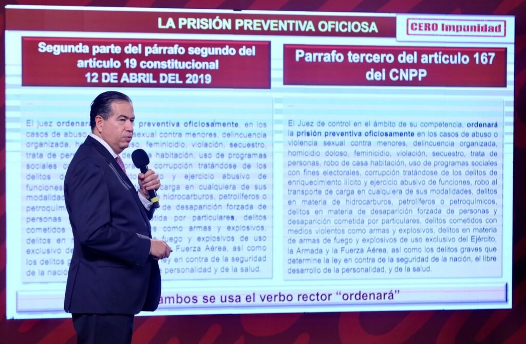 Sobre el debate en la Suprema Corte de Justicia de Nación (SCJN) con relación a la permanencia de la prisión preventiva oficiosa, indicó que “es fundamental mantener no sólo el Artículo 19 constitucional, sino también el Artículo 167, el cual hace efectiva la vigencia de ese artículo”.