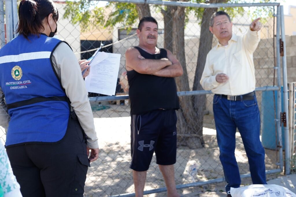 Luego de las fuertes lluvias ocurridas en Ciudad Juárez los días 19 y 20 de septiembre, personal operativo de la Coordinación Estatal de Protección Civil (CEPC), la Subsecretaría de Desarrollo Humano y Bien Común (SDHyBC) y el representante de Gobierno del Estado Zona Norte, Oscar Ibáñez Hernández, acudieron hoy al fraccionamiento Senderos de San Isidro para revisar el funcionamiento de los diques que se encuentran en el lugar y llevar insumos y material de construcción a las familias afectadas por las inundaciones.