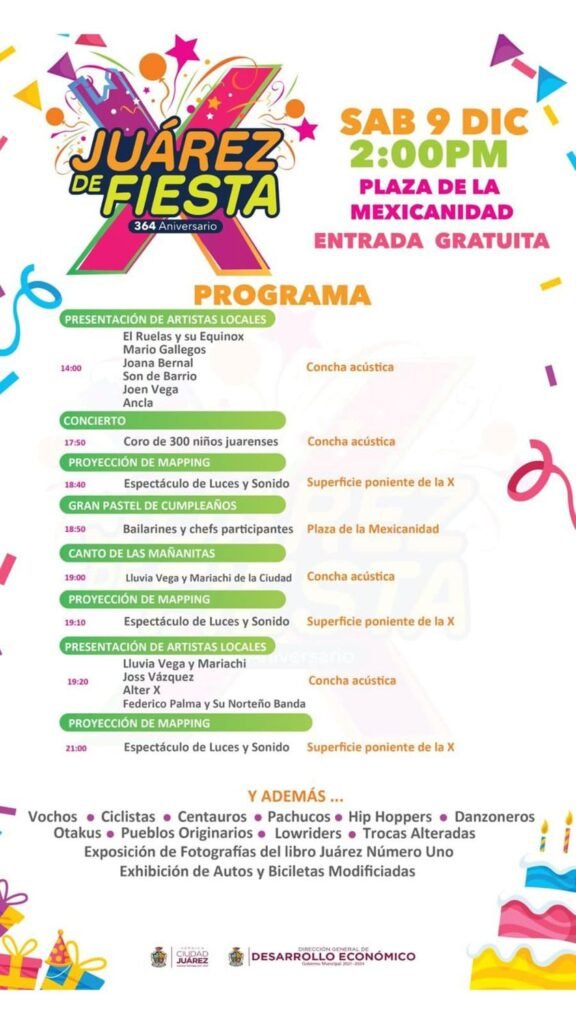 En el marco de los festejos por el 364 aniversario de Ciudad Juárez, la Dirección General de Desarrollo Económico invita a la ciudadanía a “Juárez de Fiesta”.