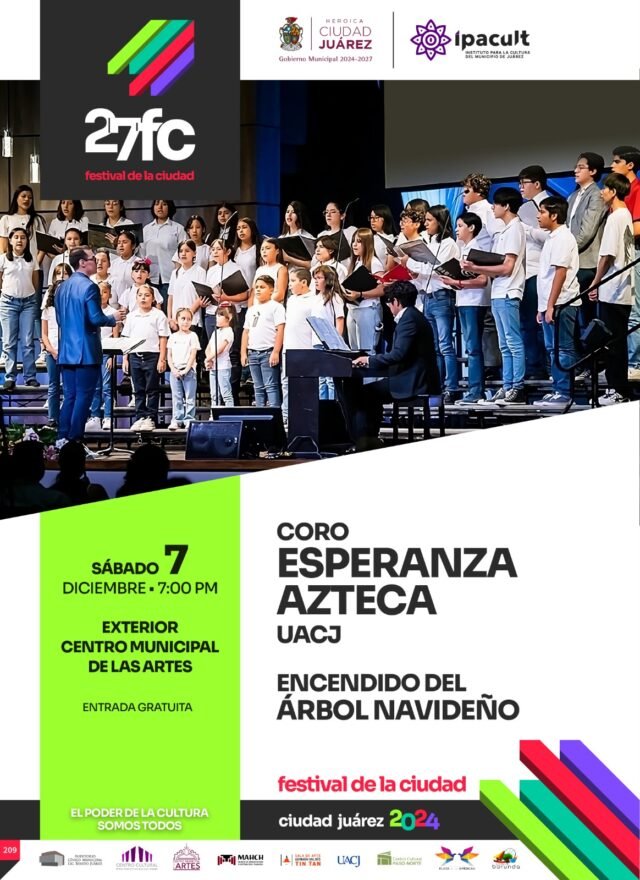 La cita es en el Centro Municipal de las Artes (CMA), ubicado en el Centro Histórico, donde se llevará a cabo el tradicional encendido del árbol navideño acompañado de un concierto del Coro Esperanza Azteca de la Universidad Autónoma de Ciudad Juárez (UACJ).