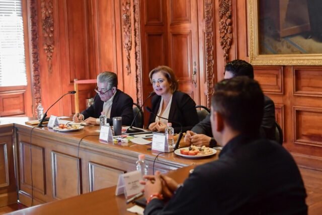 La gobernadora Maru Campos se reunió en una mesa de trabajo, con autoridades de seguridad pública, ex gobernadores y líderes empresariales, para escuchar sus planteamientos, propuestas, experiencias y prácticas de participación ciudadana, que contribuyan a generar un diagnóstico que defina hacia dónde puede y debe avanzar el Estado, para fortalecer la política pública en materia de seguridad.