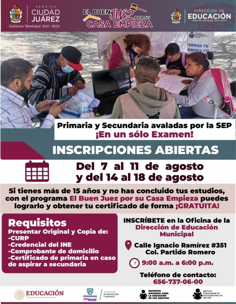 A través del programa “El buen juez por su casa empieza”, la Dirección de Educación Municipal invita a la ciudadanía a concluir sus estudios de primaria o secundaria presentando solamente un examen.