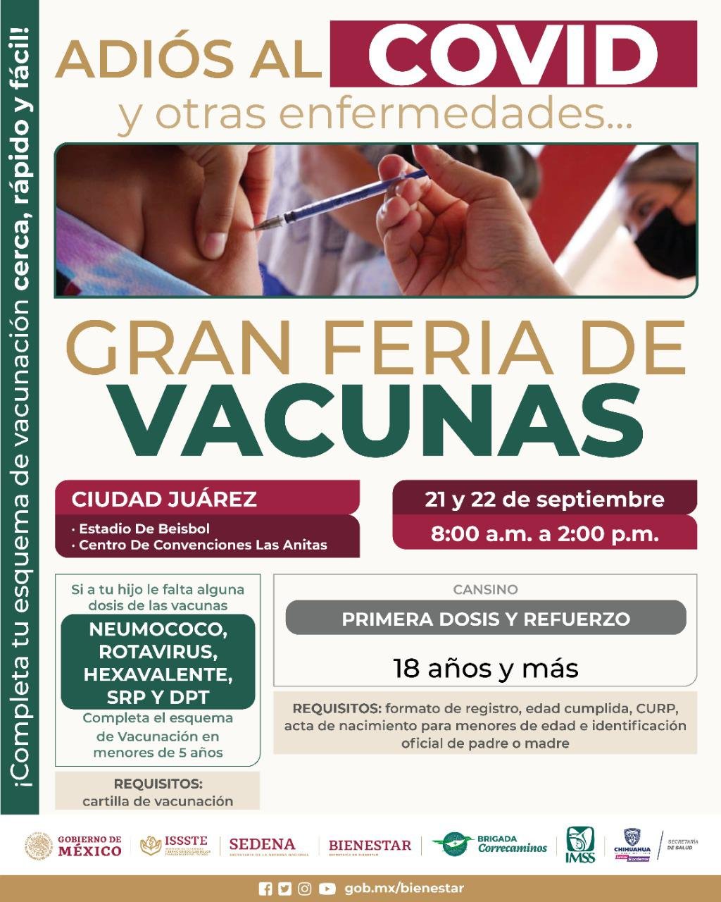 Comentó que la Feria de las Vacunas se llevará a cabo el 21 y 22 de septiembre de 08:00 de la mañana a 02:00 de la tarde en Estadio de Beisbol Juárez y el Centro de Convenciones Las Anitas.
