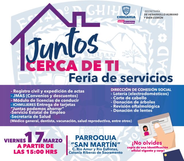 Gobierno del Estado, a través de la Secretaría de Desarrollo Humano y Bien Común (SDHyBC), invita este viernes 17 de marzo a la ciudadanía a la feria de servicios gratuitos “Juntos Cerca de Ti”, en la colonia Riberas de Sacramento en la ciudad de Chihuahua.