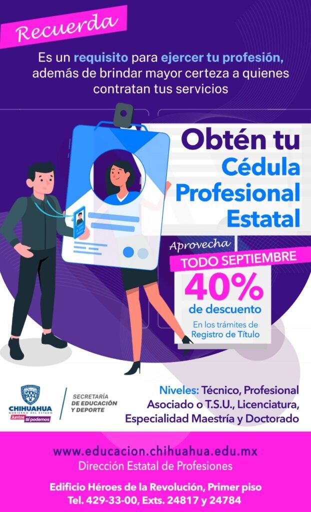 La Secretaría de Educación invita a los profesionistas y recién egresados de las instituciones de educación técnica profesional y de nivel superior a aprovechar los últimos días de descuento del 40 por ciento en el trámite de la Cédula Profesional Estatal.